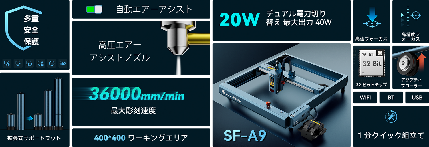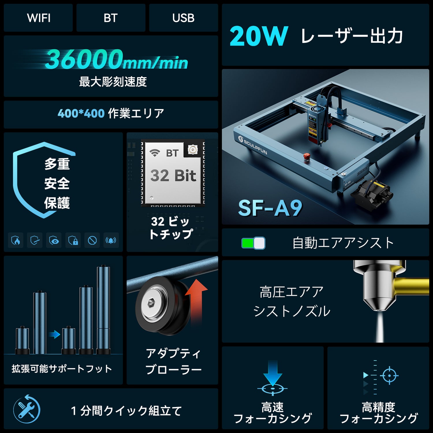 SCULPFUN SF-A9レーザー彫刻機は、20Wの強力な出力レーザーモジュールを搭載しており、彫刻だけでなくカッティングにも優れています。1回のカットで20mmの桐材や5mmのMDF板を切断することが可能です。さらに、ヒートパイプ式放熱システムにより、より高速かつ均一な冷却性能を実現しています。