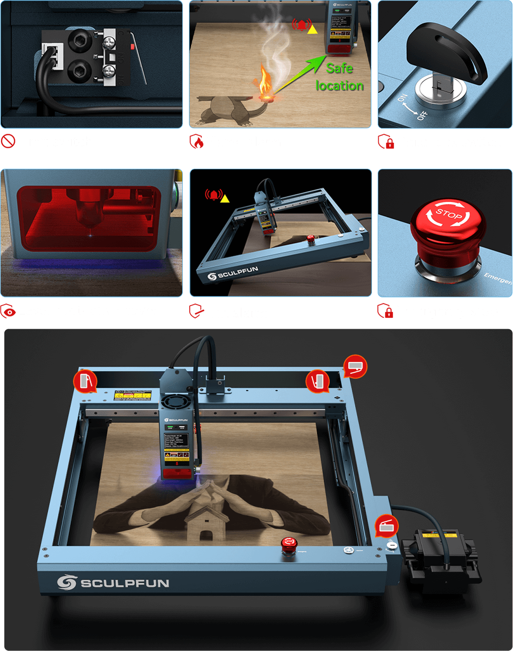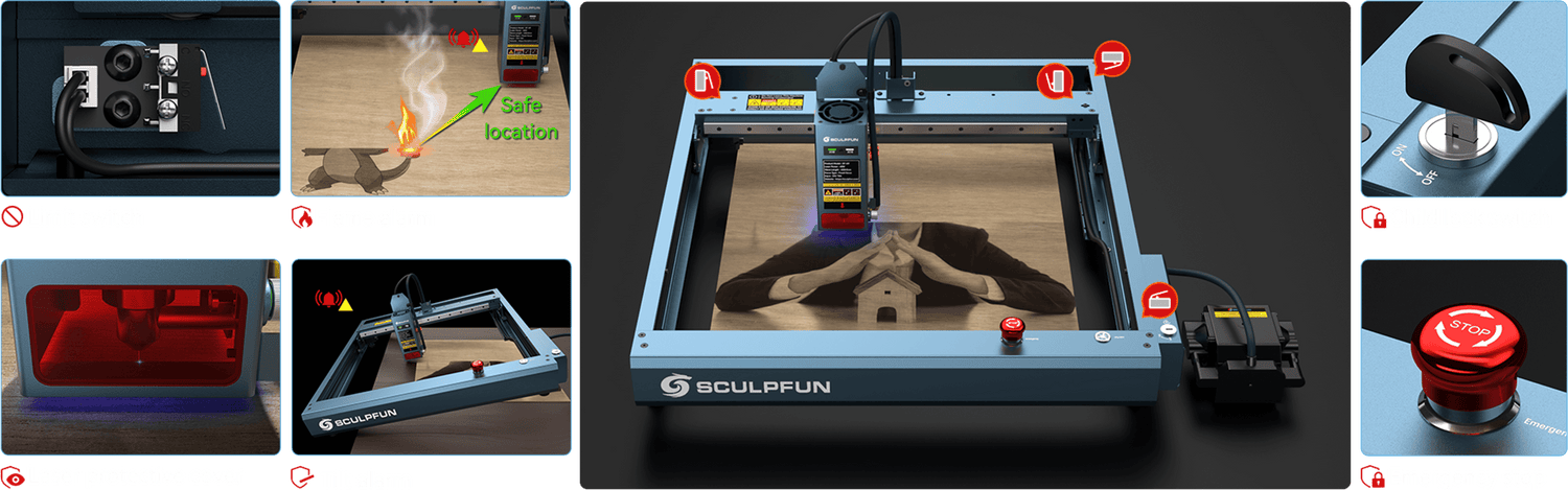 安全保護設計:傾きセンサーを搭載しており、本体が傾き 15° を超えるとアラームが作動し、レーザー照射が停止します。また、緊急停止スイッチやチャイルドロックスイッチ、炎・温度センサーも装備。作業中に炎を検知すると、炎・温度センサーが作動し、アラームと共に機械は自動的に安全な位置に移動して動作を停止します。